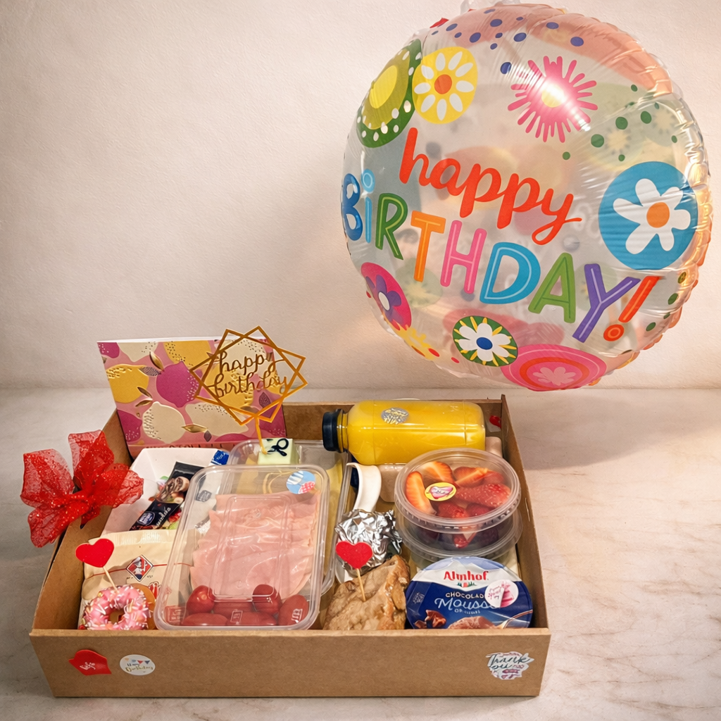 Feest aan tafel! Van luxe lekkernijen tot feestelijke details: wij zorgen dat de jarige de dag met een glimlach begint. Ballon erbij? Geen probleem!